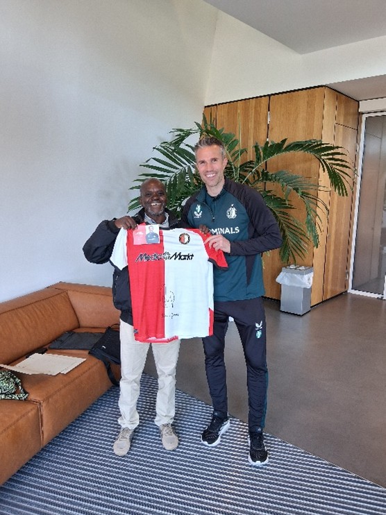 Op 29 maart kwam Justine Ojambo aan op Schiphol. Hoewel hij officieel geen coördinator meer is van het project is hij nog wel verantwoordelijk voor fondswerving. Gedurende zijn verblijf in Nederland hebben we verschillende oudere donateurs opgezocht in het zuiden van het land. Ook hebben we ontmoetingen gehad met verschillende donateurs in Friesland en een donateur in Groningen. We brachten met hem een bezoek aan het bestuur van Stichting de Waterlander. Tot onze grote vreugde kregen we daar te horen dat Pefo Uganda een nieuwe bus mocht kopen voor het vervoer van de kinderen van de bibliotheek! Een ander hoogtepunt, met name voor Justine, was het bezoek dat wij met hem brachten aan Robin van Persie, zijn grote held. Foppe de Haan die zijdelings betrokken is bij ons project, had dit geregeld! We kregen ook bezoek van twee mensen van de Odd Fellows die een cheque van 2000 euro overhandigden voor ons project.