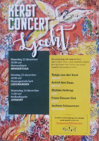 Ter gelegenheid van de drie kerstconcerten georganiseerd door Tetsje van der Kooi werden we op 20 december uitgenodigd voor het programma Op & út van Omrop Fryslân. Dit programma werd rechtstreeks uitgezonden. We kregen ruimschoots de tijd om ons verhaal over de grannies te vertellen.